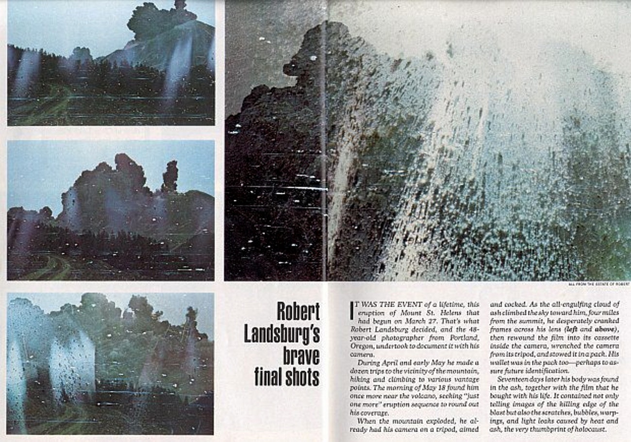 On the morning of May 18th 1980, he was within a few miles of the summit. When the mountain erupted, Landsburg took photos of the rapidly approaching ash cloud. Knowing he was going to die from the nearly supersonic pyroclastic flow about to overtake him, he rewound the film back into its case, put his camera in his backpack, and then laid himself on top of the backpack in an attempt to protect its contents. Seventeen days later, Landsburg’s body was found buried in the ash with his backpack underneath. The film was developed and has provided geologists with valuable documentation of the historic eruption.
