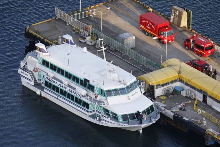 The collision at around 12:15 pm on Saturday 9th March did not prevent the jetfoil from reaching its destination on Sado Island, according to ferry operator Sado Steam Ship Co. A 15-cm crack was found at the stern.